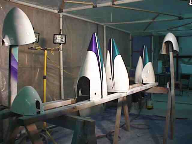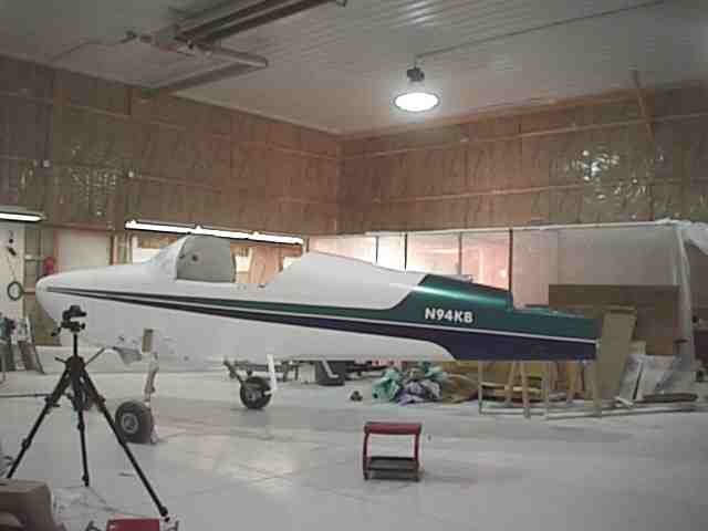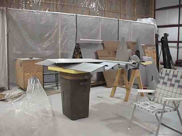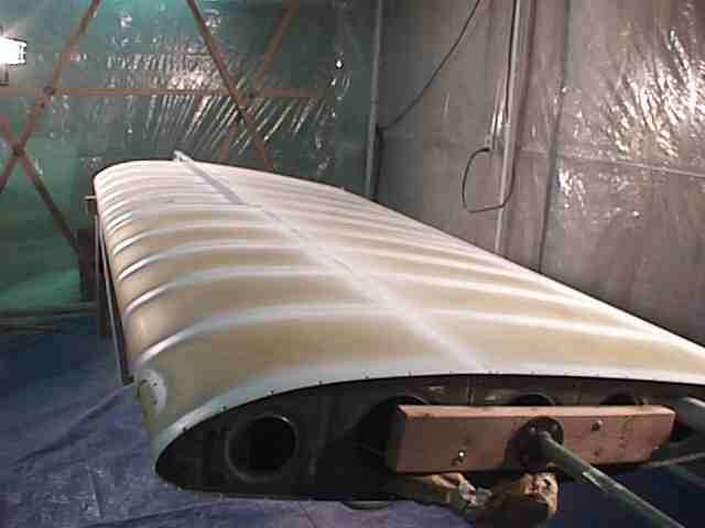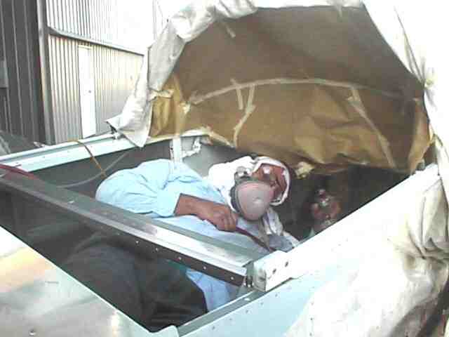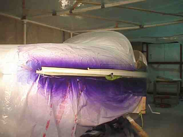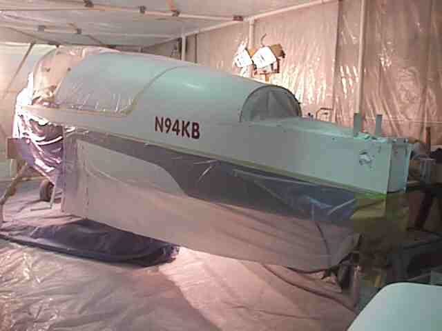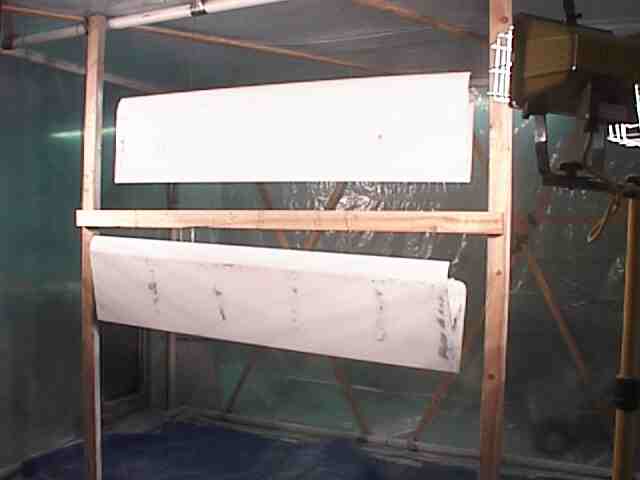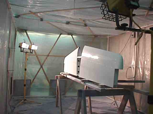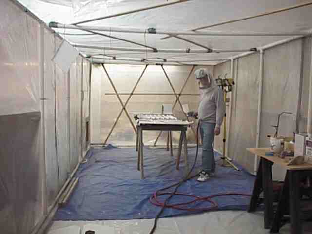 The exterior was painted during the winter in Minnesota. I constructed a paint booth frame out of 1 1/2 inch PVC and covered it with poly. The booth was 10 x 25 feet allowing me to get the fuse in, have a mixing table and maneuvering room. One end had the door which was a drop curtain and a bank of furnace filters. The air was exhausted with two blowers. I used old blowers from a furnace. The air was directed by a poly chute to an exterior door. The open door had a baffle with only openings for the exhausted air. If you don't have an active air flow the overspray will settle on your wet surface. I built an external air supply for breathing. An old shop vac provide the air to a flexible tube (left over corrugated conduit) to a face mask constructed from a face shield covered with a plastic bag. The air supply hose was attached to the top of the shield and blew over my face. This worked fine except that I didn't have a tear off shield covering and it was a lot of trouble keeping the visibility good through the mask. The booth was made out of translucent material but there is never enough light in the booth. I used four 500 watt halogen lights on stands which could be moved to light the areas I was painting. This was not enough as it was not always possible to see the laydown clearly. A friend later told me that he painted with a light in one hand and the gun in the other. Get plenty of light - do not paint by Braille.