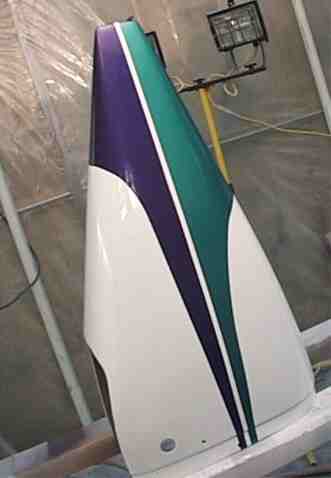 I decided that I wanted to use metallic paint for the exterior trim colors. My past experiences with single stage metallic caused me to use a basecoat/clearcoat method for the exterior. Sunfire wasn't available in two stage systems and the SW Ultra required clear coating within 6-8 hours of applying the base. I switched to the Akzo Sikkens autobase/autoclear (http://www.sikkens.com/) system as it allows more control over the time for putting the clear on. I had to spray on the base then mask and spray two colors of trim before putting clear over all ot it. The sikkens systems allows 24 hours before the final sealing. Metallic colors are somewhat translucent and the entire area must be the same color. I didn't want to spray the white base over areas covered by the trim so I used a white primer. I put this white primer over a vinyl wash primer. It can be used as a surfacer or sanding/surfacer depending on how it is mixed. Extra primer was put over the rivet lines but not enough to fully cover them, after all this is a metal airplane. The wings were painted with the tanks on but not fully screwed down. A few screws were used with filed down heads allowing paint to cover the countersink holes. Later the tanks were attached with stainless screws (yes, I know these are not as strong as the AN ones). The tanks are now removable without upsetting a paint line.
