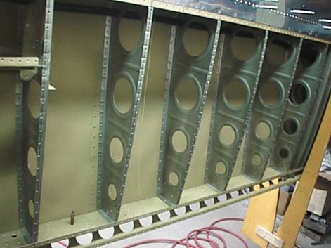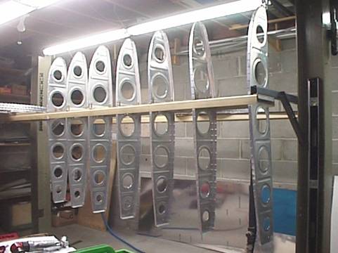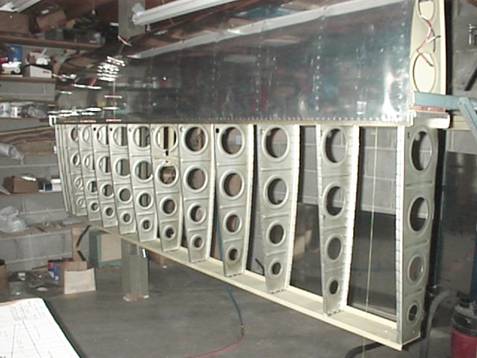 Updated 1/11/03 Construction of Wings I completed the wings at 415 hours into the project. This page describes the construction of the RV-4 wings. I started with the same wing jig as used on my RV-6. This jig is was made from some 6" fiberglass I beams purchased from a surplus store. The arms holding the two main spars are made from rescued bed frame steel. Building both wings at the same time works well for me until I start skinning the aft parts of the wing. This background picture shows some of the trailing edge ribs after the center holes have been removed.