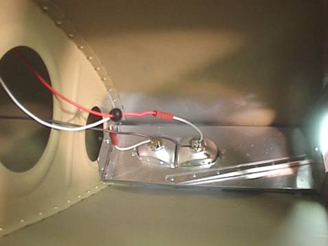 The leading edge and tank were fitted before the main skins. The picture below show the landing light installation in the right leading edge. I bought the lens from Van's for the Duckworth lights and made my own installation from Walmart driving lights. The each light has two 55 watt bulbs. I was concerned about the heat generated and tested the for several minutes in an ambient condition with no air flow. There was not problem with overheating of the lens or the interior painted surfaces.