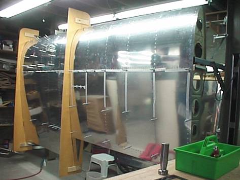 The ailerons and flaps are finished and the flap is test fitted with the alignment jigs. The top skins are read for riveting. They were back riveted using the bucking bar shown next to the green cleco container.
