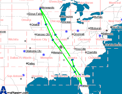 We decided to fly along the dry line west and the go directly north to cross the front. Course was set for Walnut Springs, AR. We flew above a broken layer at 8500 ft until just east of Memphis, then turned direct to Minneapolis and stopped at Perryville, MO for fuel and another review of the current weather. As forecasted the big stuff was along the Iowa - Nebraska border and near Chicago, leaving an opening along the route.